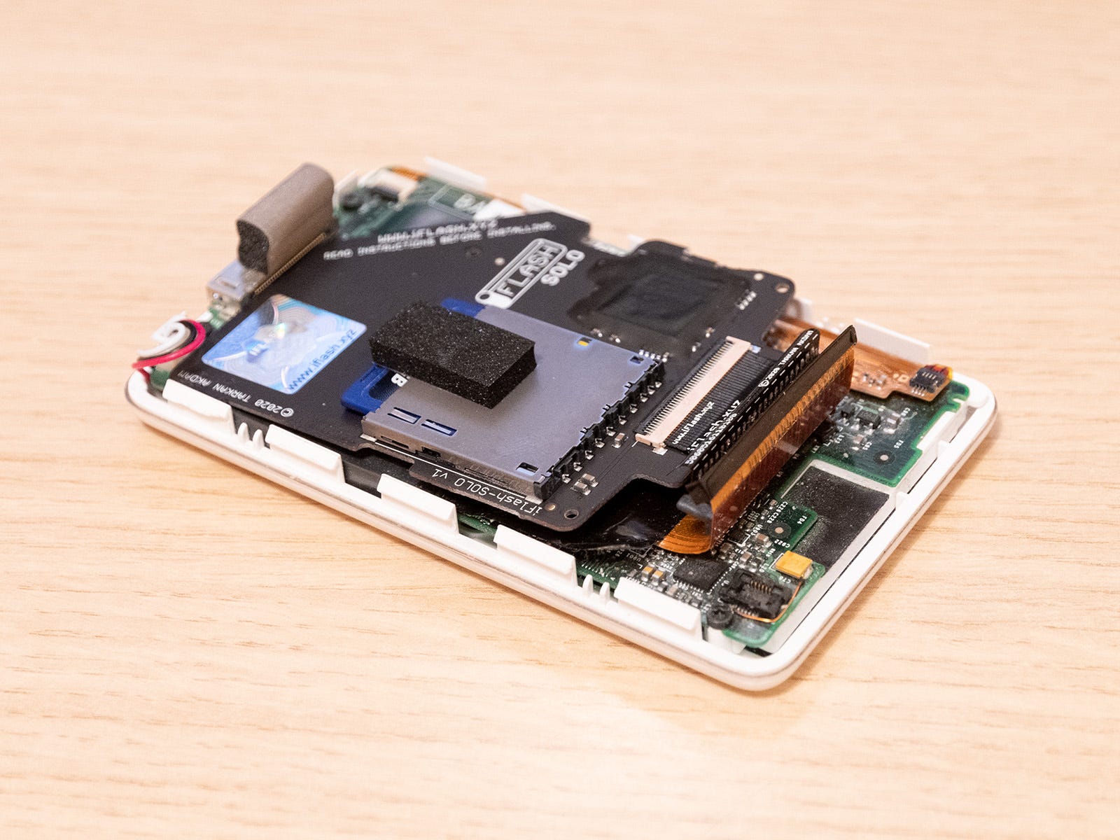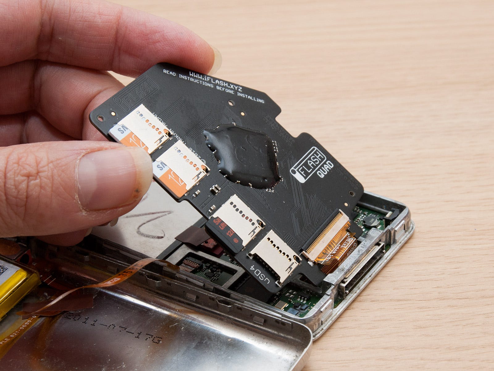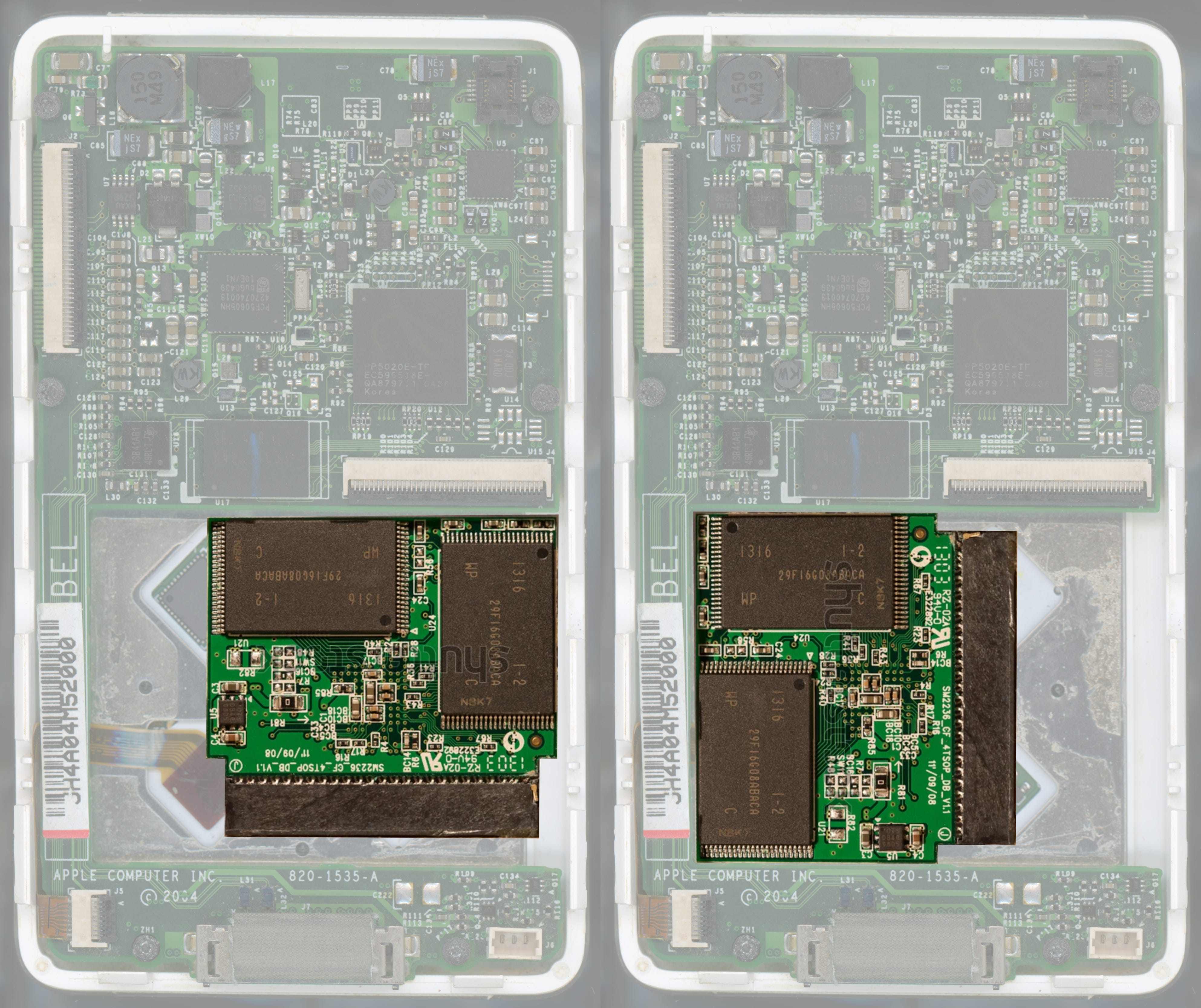 The only thing to be careful of when using these adapters however, is that depending on the adapter card’s design, the MicroSD card may overhang the PCB edge. In the case of the adapter above, this overhang is ~1mm. So with both cards populated, the board width is effectively 39mm, not 37mm. The overhanging card can be spaced using foam tape to clear the iPod main board and any components on it. This foam also maintains a reasonable bend radius on the flex around the header pin pads.