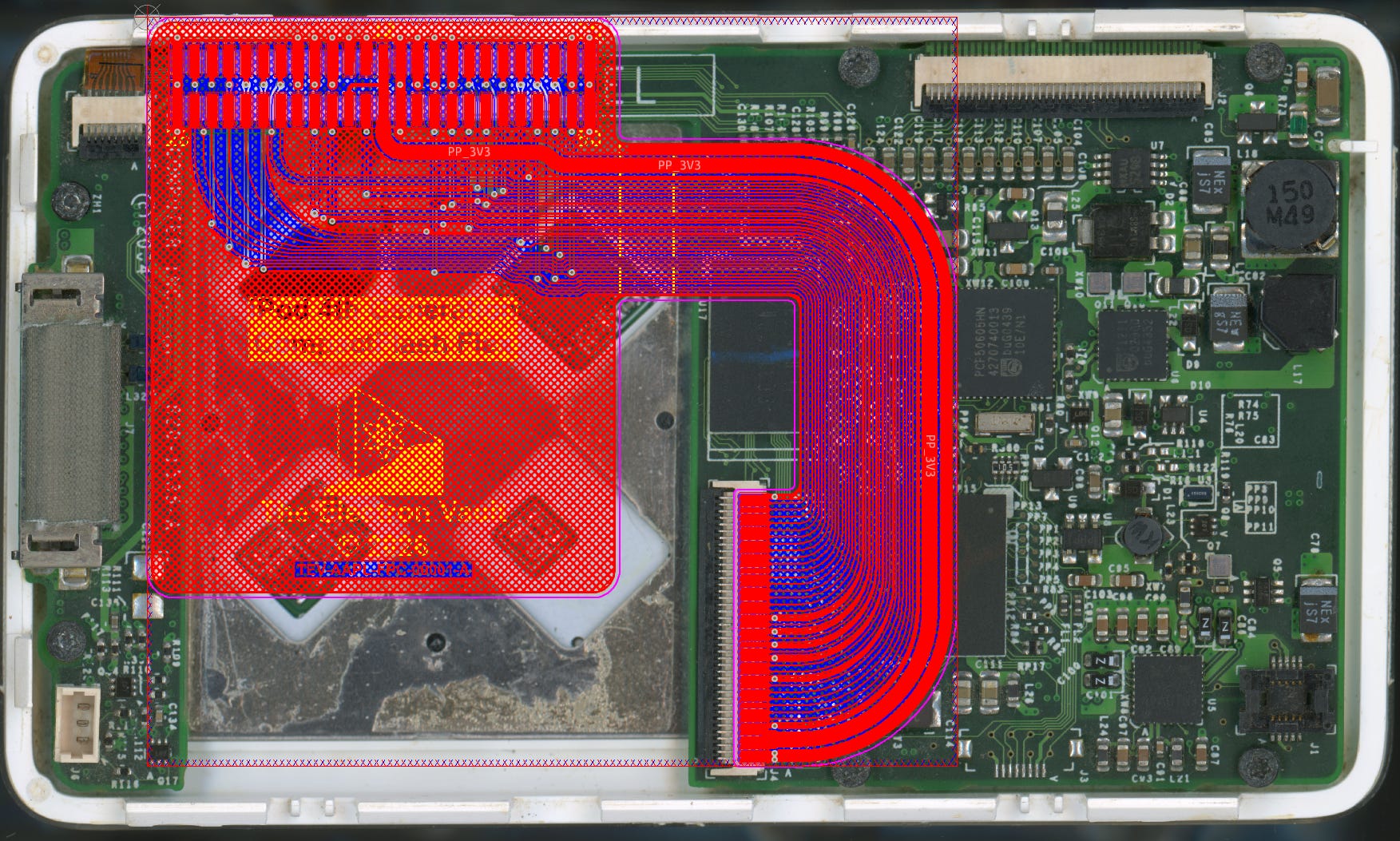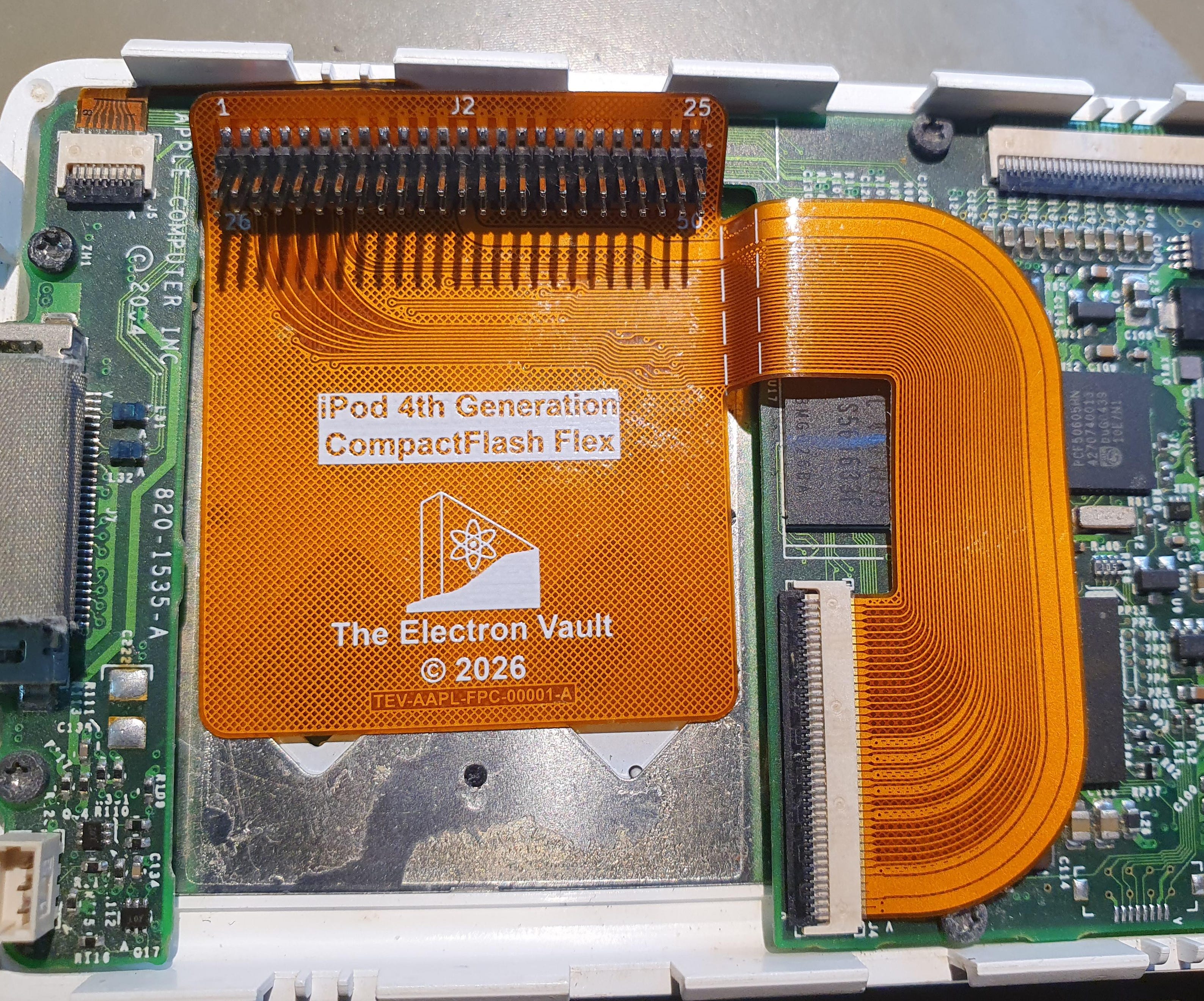 The source and manufacturing files for this cable are as usual, available on Git here. I extended the apron underneath the flash card to dual purpose the flex as an insulator between the CF card and the metal backing plate for the click wheel. There’s no trackwork in this area though, so if necessary, it can be cut off without affecting function.