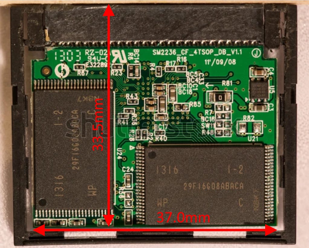 So all bets are off then, right? Not quite. Although the CompactFlash enclosure is just barely too large, the PCBA contained within it is most certainly smaller.