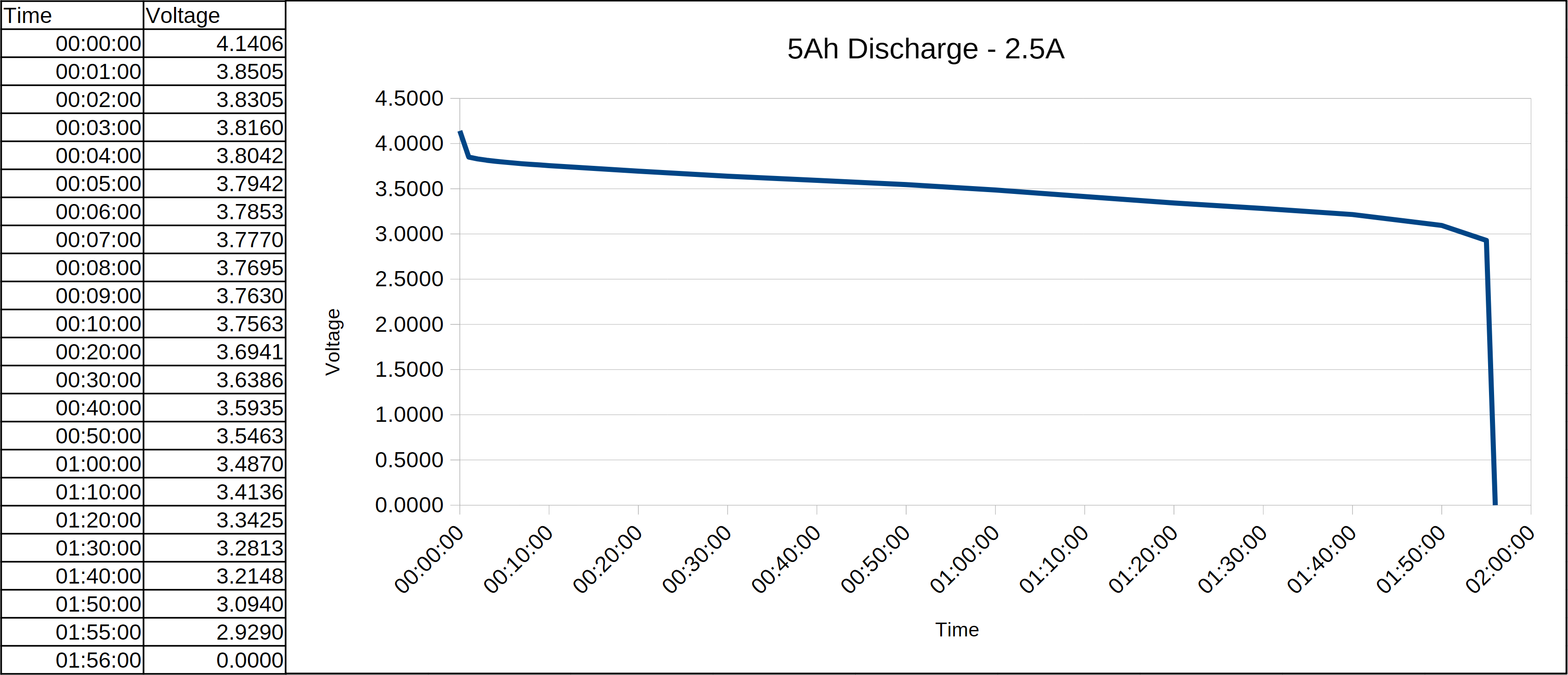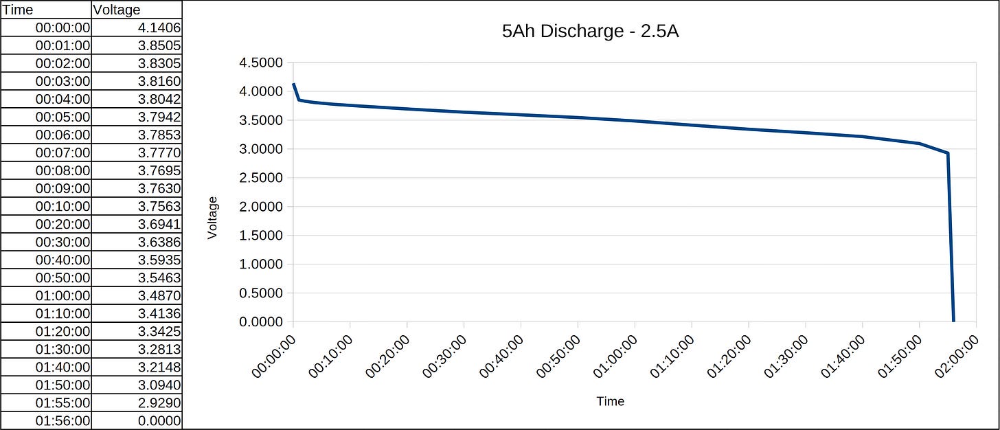 Out of curiosity, to validate these cells were actually 5Ah and not something smaller with a fraudulent label, I decided to run a constant-current discharge test. With a 2.5A (0.5C) load, the expected time to discharge should be approximately 2 hours.
