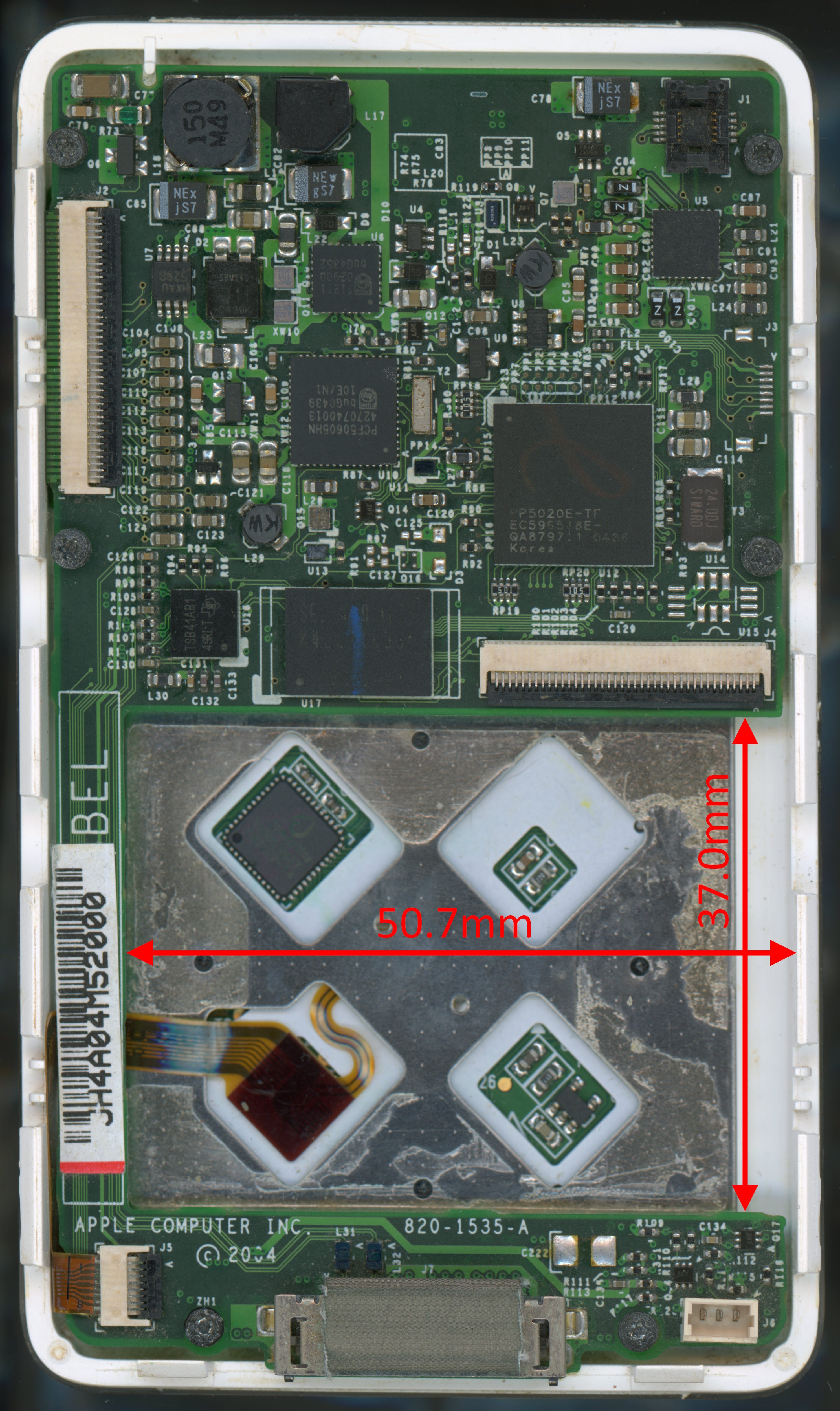 The battery cavity measures 50.7 x 37.0mm. Note that the bottom edge of the cut out above the dock connector has three mouse bites (PCB breakout tabs) remnant from the manufacturing panel. If these were filed back to be flush with the edge, the length of the cut out would be 37.4mm.