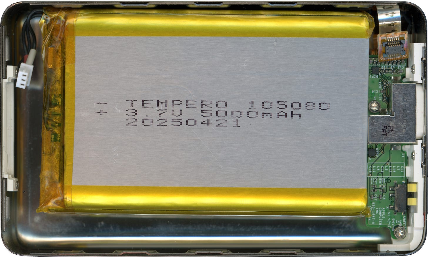 They seem to come with JST PH connectors fitted, in either 2-pin (power only) or 3-pin (power + thermistor) variants. The PCM is the same for both however, so even if you can only find the 2-pin variant, it’s trivial to peel back the polyimide tape covering the PCM board and solder an additional lead to the thermistor pad (I did confirm that my pack was fitted with a 10K NTC, but YMMV). This will need to be done in any case to replace the JST PH cable harness with the Molex PicoBlade used on the iPod.